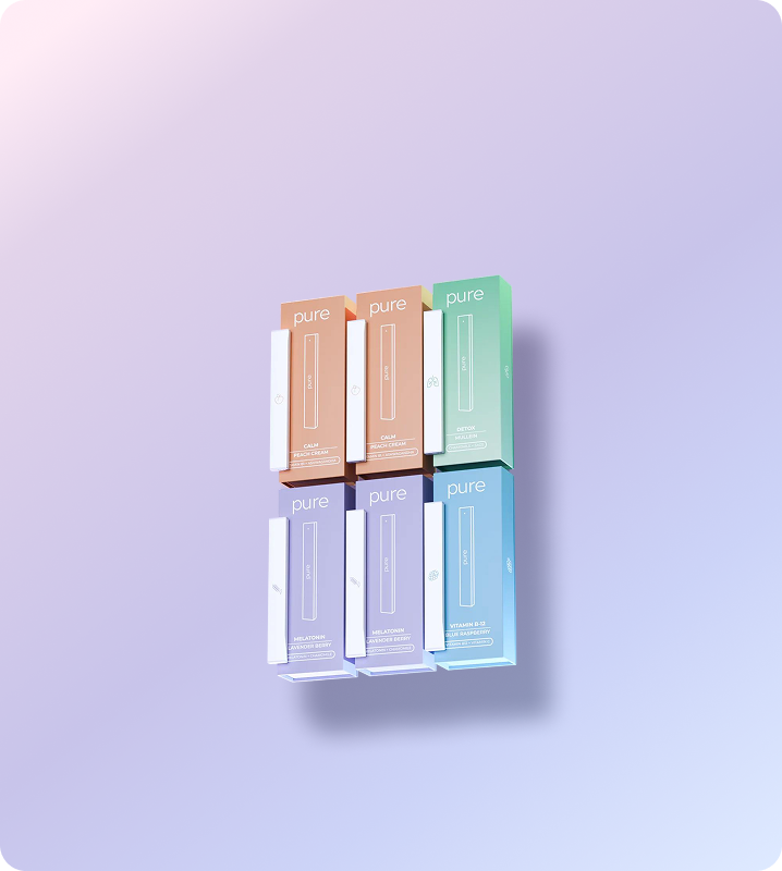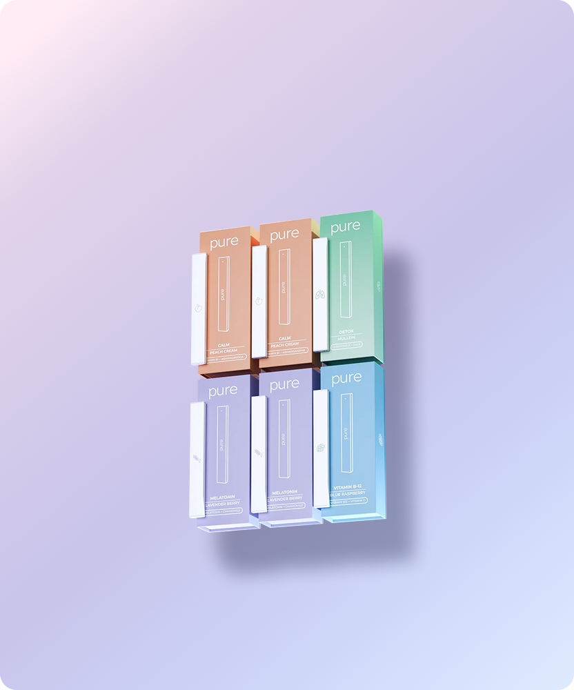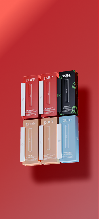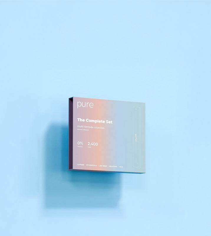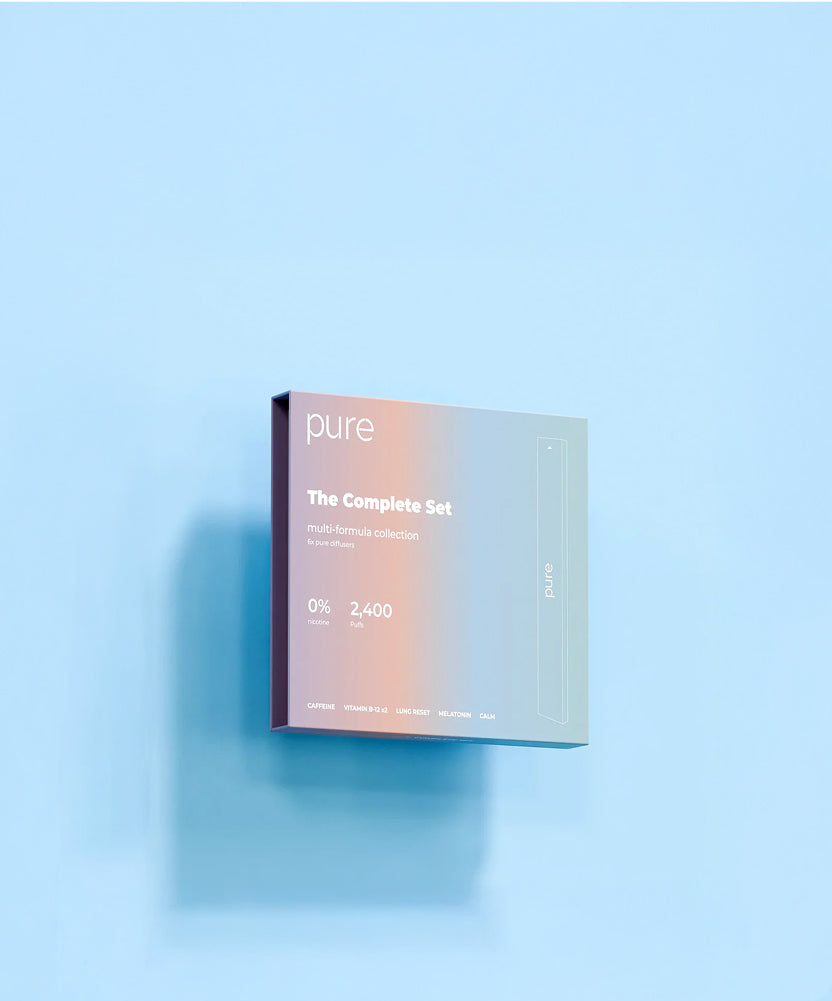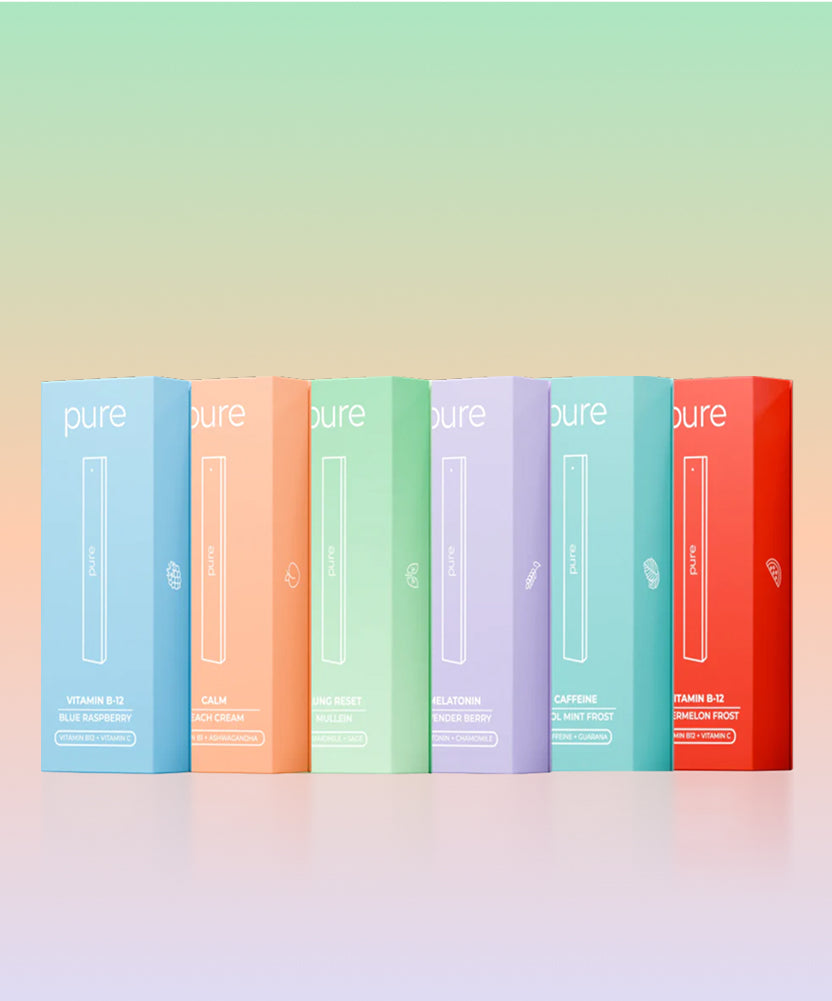 The main ingredients in the diffusers include active elements like caffeine, Vitamin B-12, melatonin, and a blend of natural extracts. PURE contains zero nic.