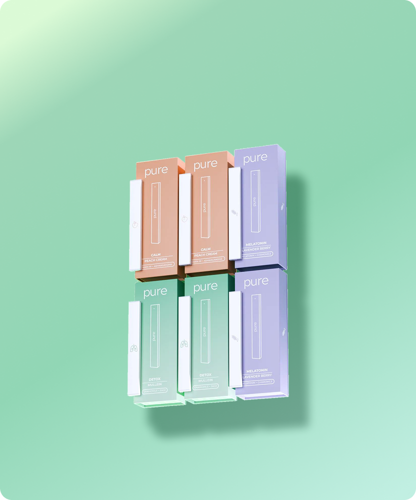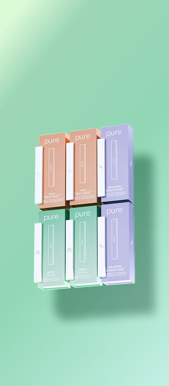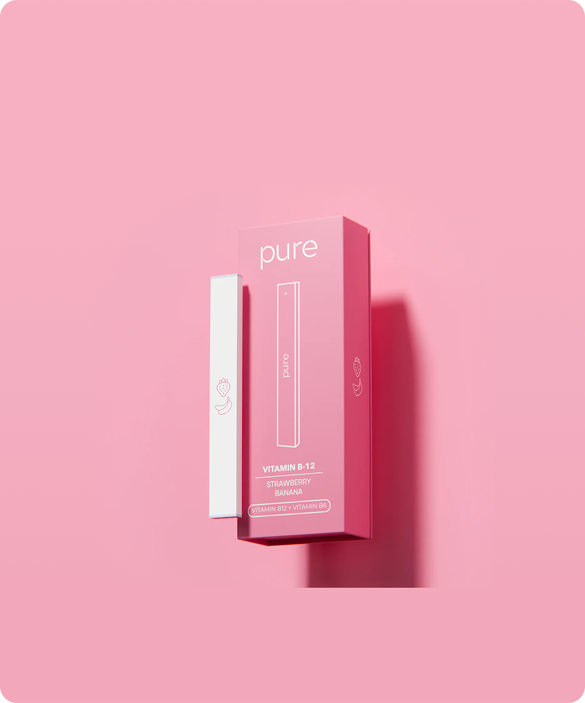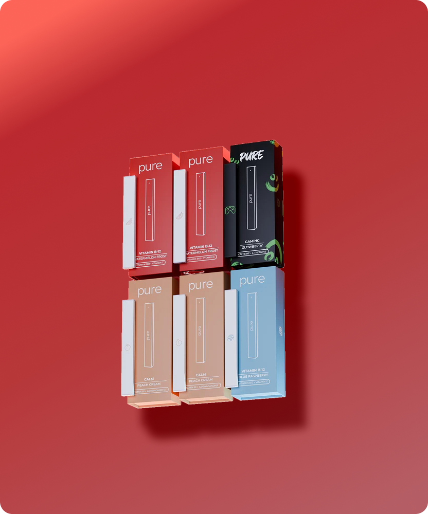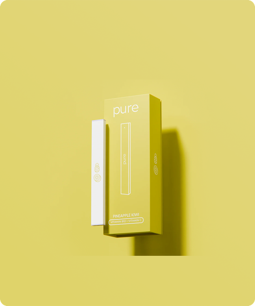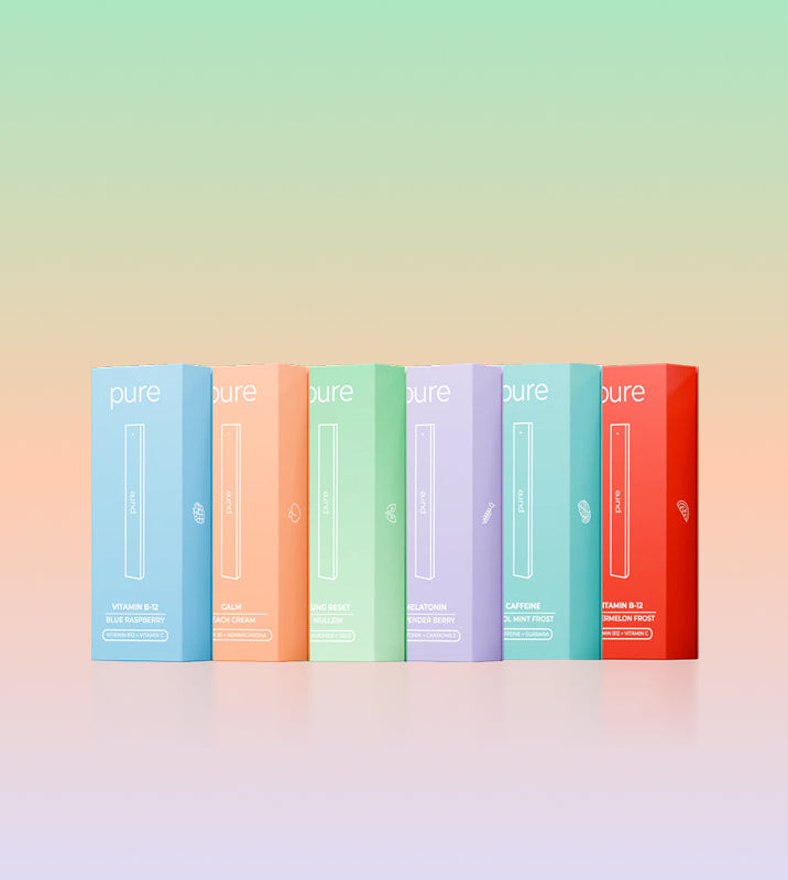 The main ingredients in the diffusers include active elements like caffeine, Vitamin B-12, melatonin, and a blend of natural extracts. PURE contains zero nic.